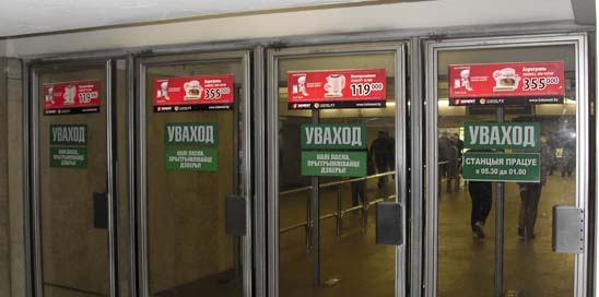 | Реклама на входных группах Минского метрополитена представляет собой наклейки с рекламной информацией на дверях на входе в вестибюль станции метро. Условия размещения: - один сюжет размещается сразу на всех дверях; - минимальный период размещения - 1 месяц; Размещение рекламных стикеров на дверях позволяет показать рекламу всему потоку входящих и выходящих со станциилюдей. Рекламные стикеры размещенные на дверях располагаются на уровне глаз человека, что облегчает ознакомление с содержанием рекламного макета и позволяет полноценно ознакомиться с рекламным сообщением. Размещение возможно на дверях входов и выходов всех станций метро, однако занятость всех дверных групп желательно уточнять заранее. | |
